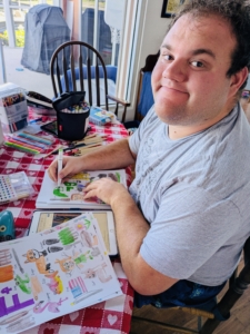 At Loveland Center’s Port Charlotte location, creativity is thriving, and one participant, Mac, is showcasing his unique talents. Mac lives with his parents, George and Sarah, who support and encourage him in his art.